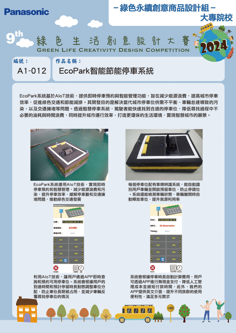 | 最佳潛力獎 | A1-012 | 空軍航空技術學院 | EcoPark 智能節能停車系統 | 李錦昂 吳峰蒼 | 吳佑旻 黃士朋 解文慈 |