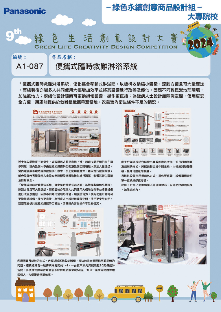 銀獎 | A1-087 | 南臺科技大學 | 便攜式臨時救難淋浴系統 | 陳亞麟 | 盧宛廷 林佳源 曾紹峻 |