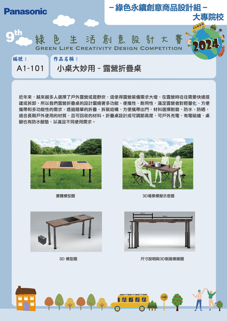 | 最佳潛力獎 | A1-101 | 南臺科技大學 | 小桌大妙用 - 露營折疊桌 | 陳炫助 | 陳素玉 徐維敏 林子喬 龍詠昕 丁千庭 范陳玉玲 |