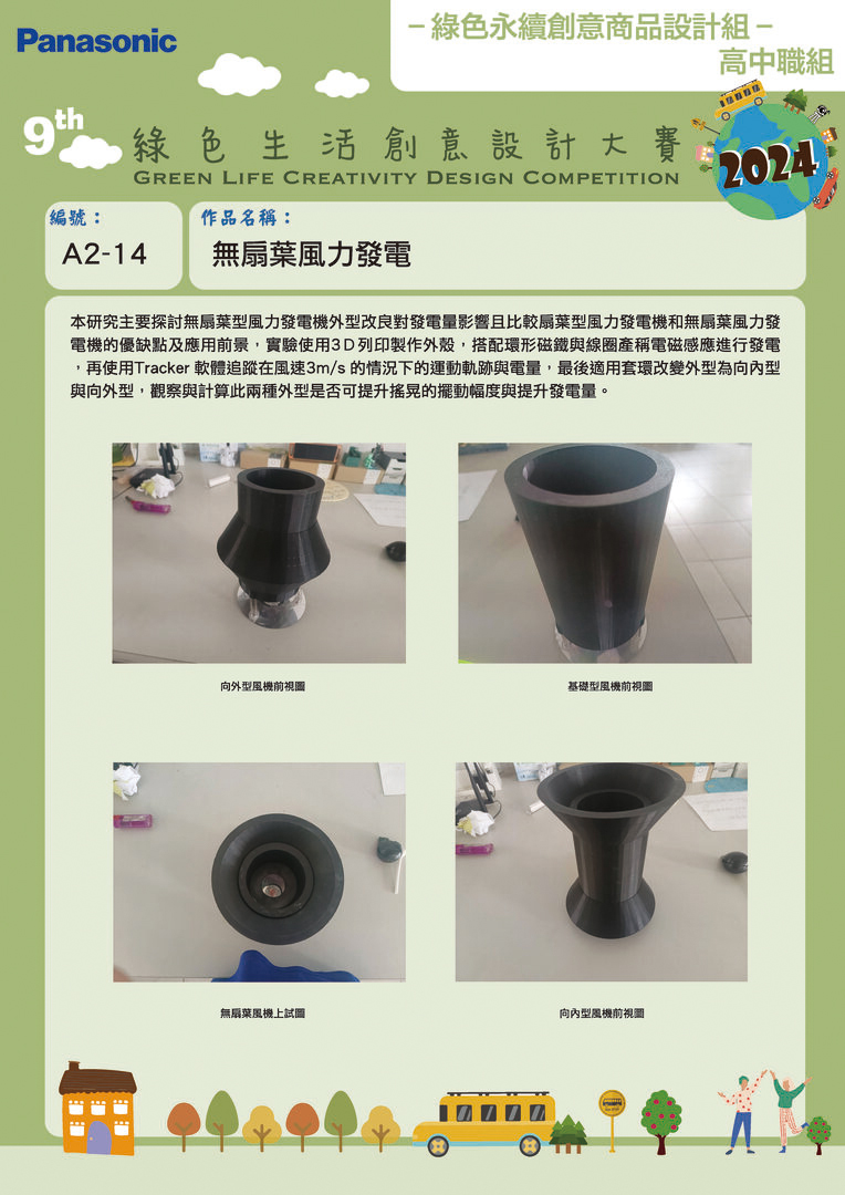 金獎 | A2-14 | 揚子高中 | 無扇葉風力發電 | 陳尚民 王新盛 吳政衡 | 李健瑋 李晉明 蕭穎凱 黃智緯 蘇宏岳 張銓祐 |