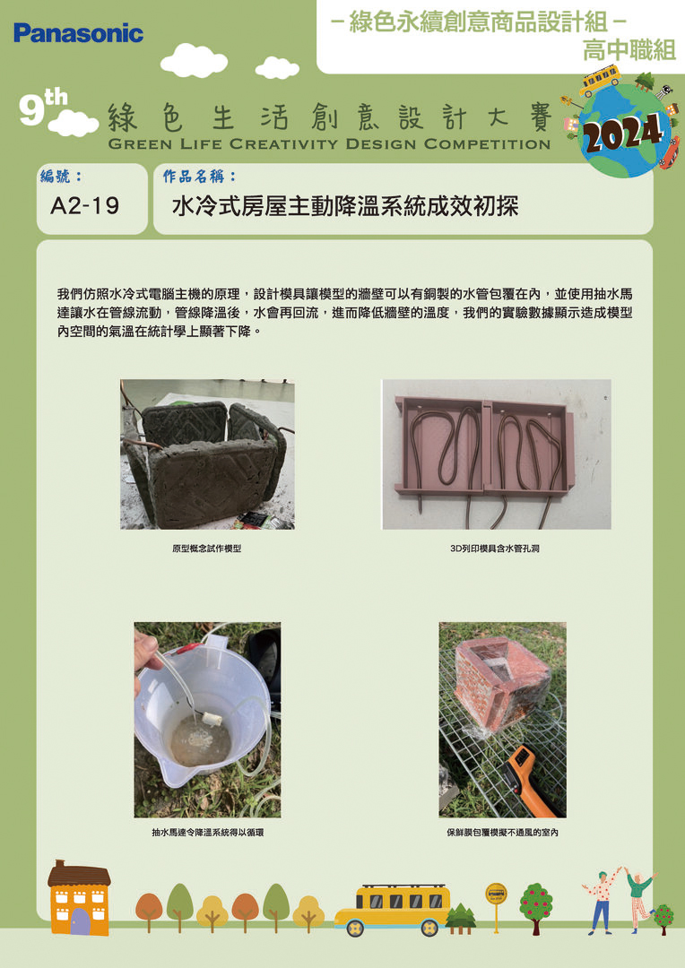 佳作 | A2-19 | 高雄市立福誠高中 | 水冷式房屋主動降溫系統成效初探 | 陳尚民 王新盛 吳政衡 | 周叡安 吳伊惠 蔡欣芯 |