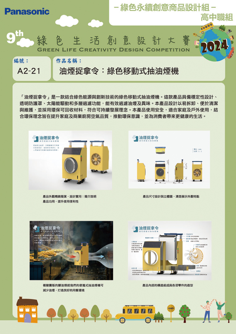 佳作 | A2-21 | 國立後壁高中 | 油煙捉拿令:綠色移動式抽油煙機 | 林玟伶 廖盈貴 | 陳怡安 潘怡君 李謹如 |
