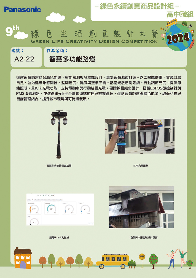 銀獎 | A2-22 | 國立東石高級中學 | 智慧多功能路燈 | 劉丁銘 張峻嘉 魏志軒 | 黃帛寓 楊金諺 柯語恩 林宗憑 陳哲銓 陳柏宇 |
