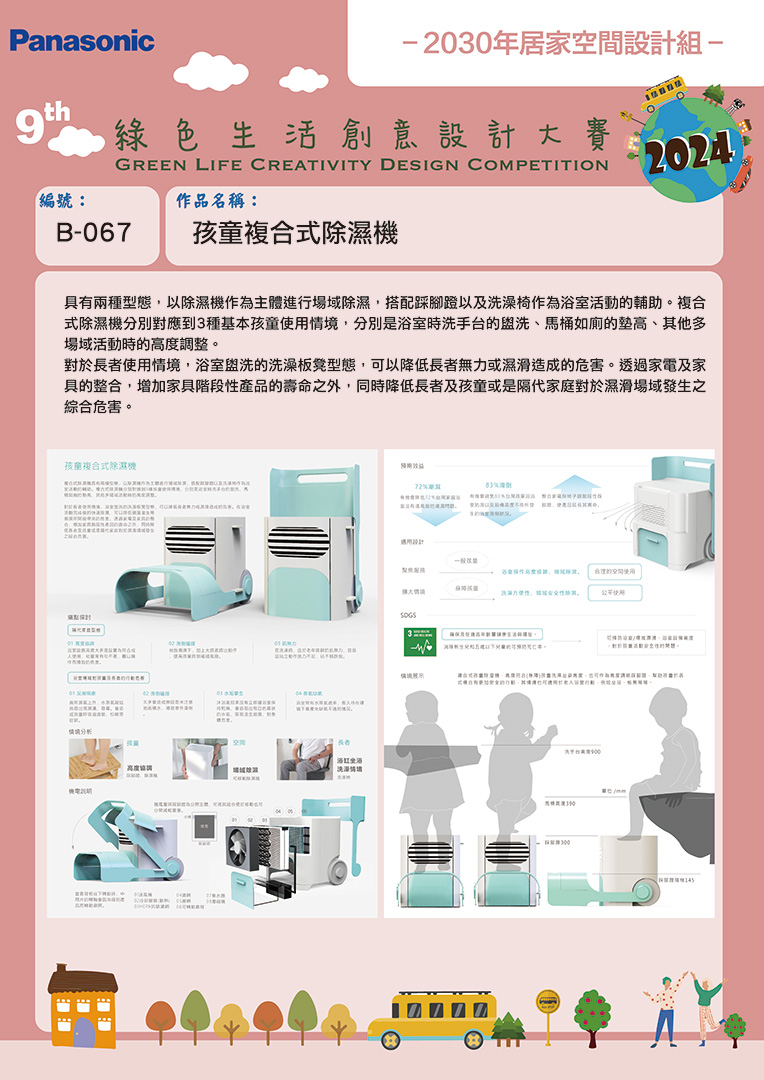 | 最佳 設計空間獎 | B-067 | 明志科技大學 | 孩童複合式除濕機 | 李鍇朮 | 葉洛瀅 |