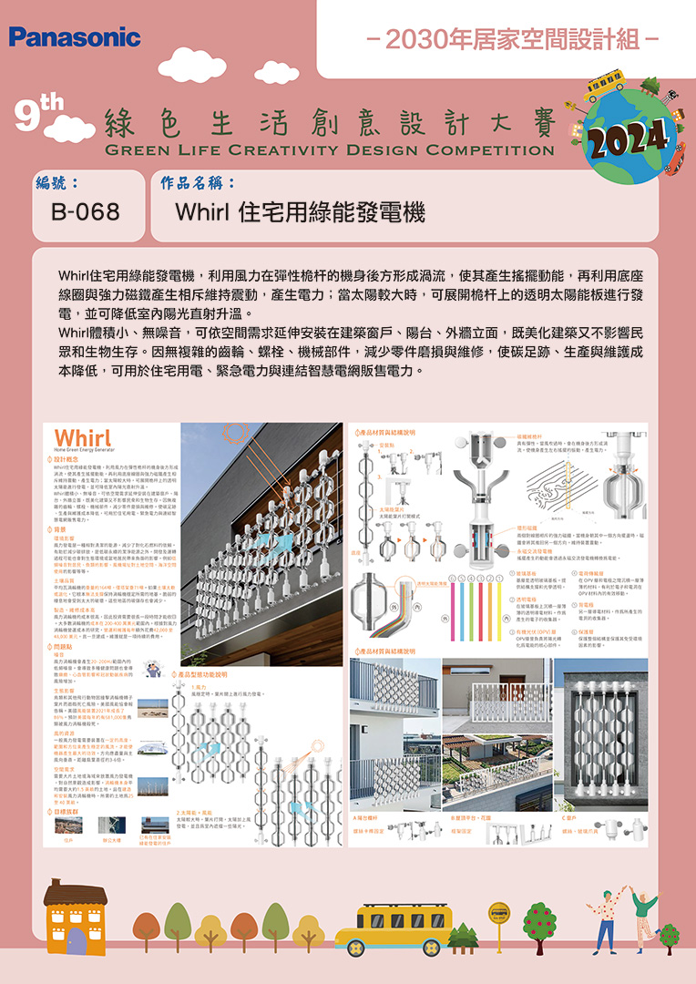 | 最佳 設計空間獎 | B-068 | 明志科技大學 | Whirl 住宅用綠能發電機 | 李鍇朮 | 林于禾 |