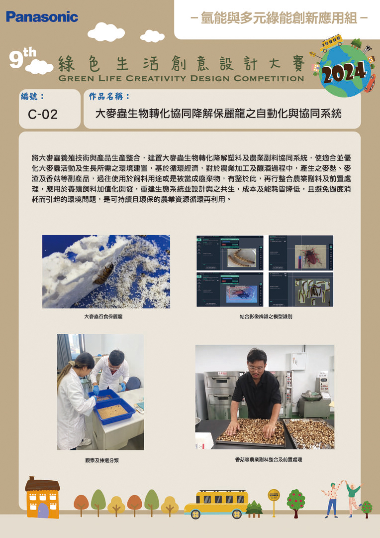 佳作 | C-02 | 南臺科技大學 | 大麥蟲生物轉化降解保麗龍之自動化與協同系統 | 黃大維 陳有圳 | 林韋成 葉宜瑄 楊惠晴 劉祉麟 李俊模 |