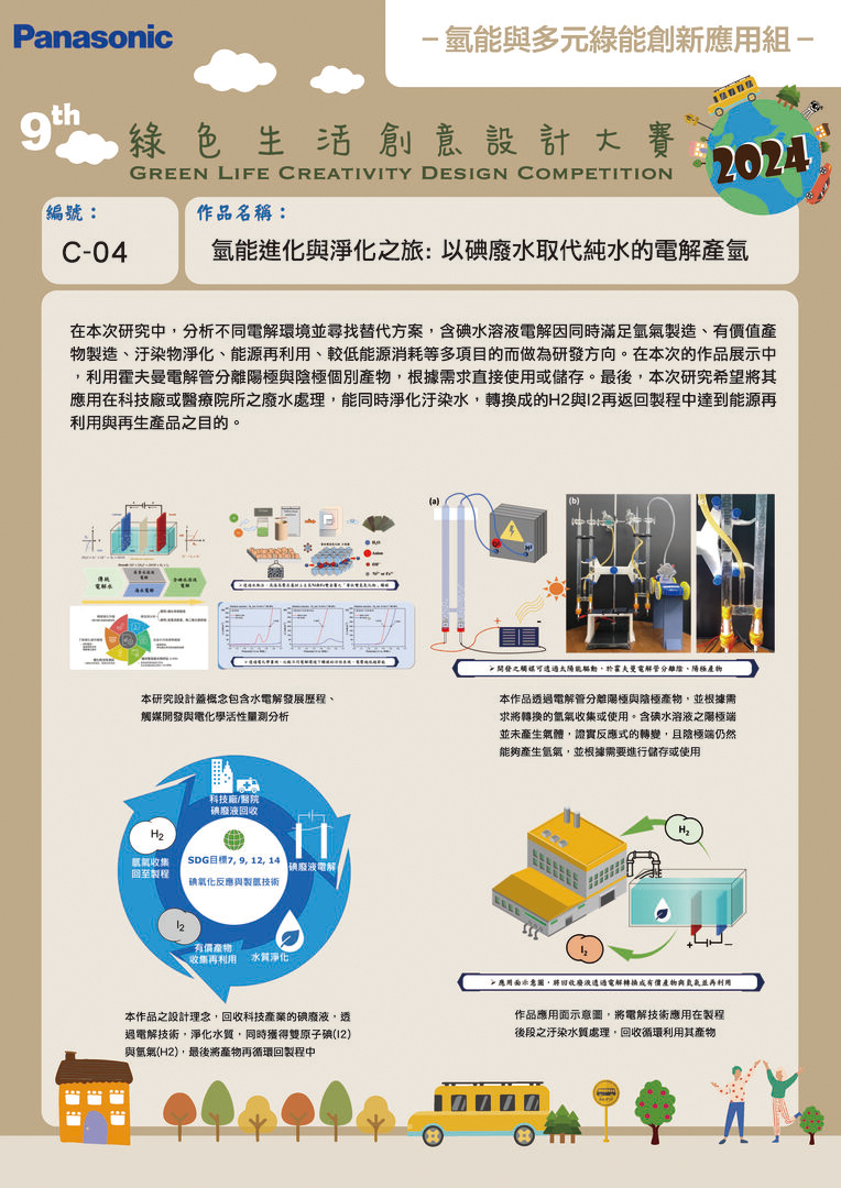 銀獎 | C-04 | 國立高雄科技大學 | 氫能進化與淨化之旅:以碘廢水取代純水的電解產氫 | 李純怡 潘俊仁 鄭力誠 | 彭嘉禾 蘇子維 高鈺琳 曾照華 吳博翔 |