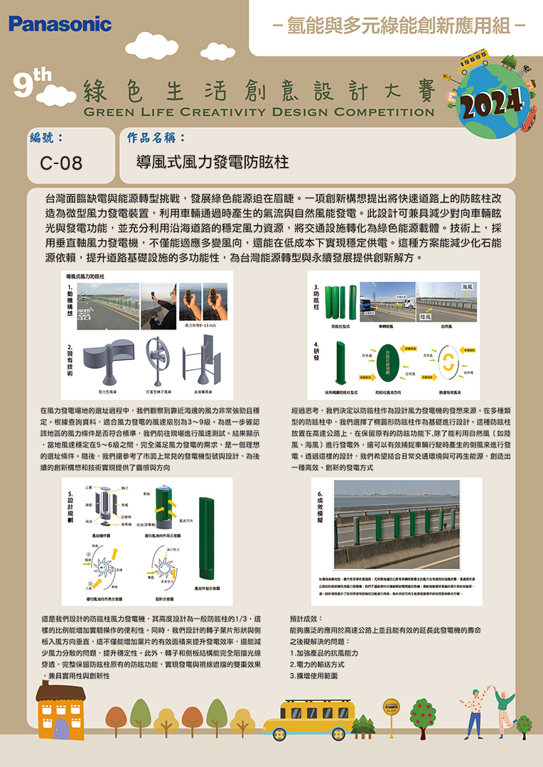 佳作 | C-08 | 國立虎尾科技大學 | 導風式風力發電防眩柱 | 謝傑任 | 李桕村 李佩珊 |